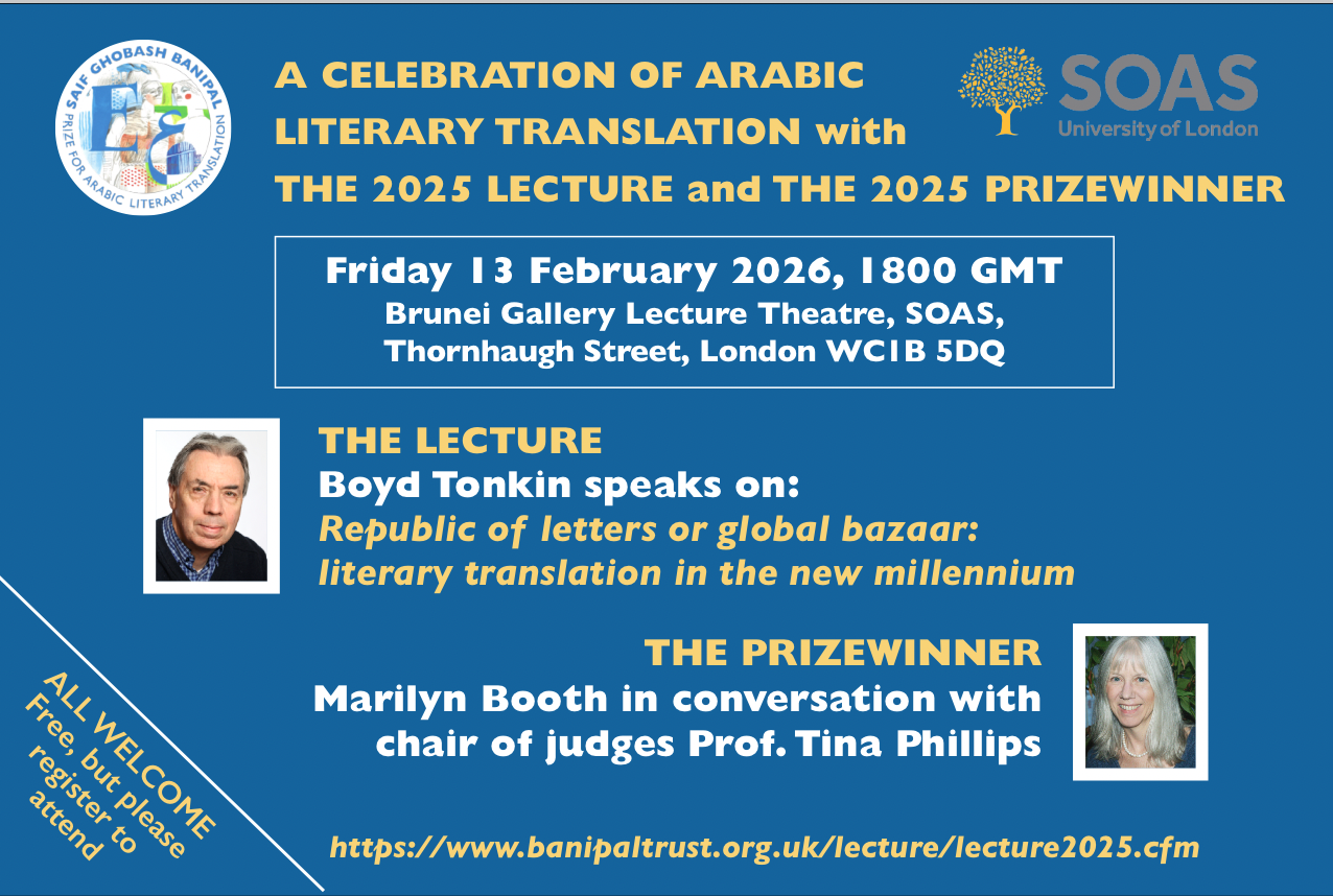 On Friday 13 February 2026, from 18:00 GMT, at the SOAS Brunei Gallery Lecture Theatre, the Banipal Trust for Arab Literature will co-host with SOAS University of London A Celebration of Arabic Literary Translation at which the winning translator Marilyn Booth will be in conversation with the chair of the judging panel Professor Tina Phillips. Boyd Tonkin, former Literary Editor at The Independent and re-founder of the Independent Foreign Fiction Prize, will give the Annual Prize Lecture on the subject: Republic of letters or global bazaar: literary translation in the new millennium. The event will be in-person and online, followed by a Q&A and a reception.